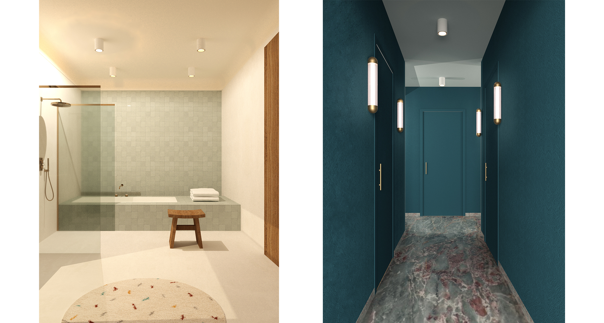 The corridor leading to the sleeping area is blue, with a few soft lights to make the space calm and relaxing.